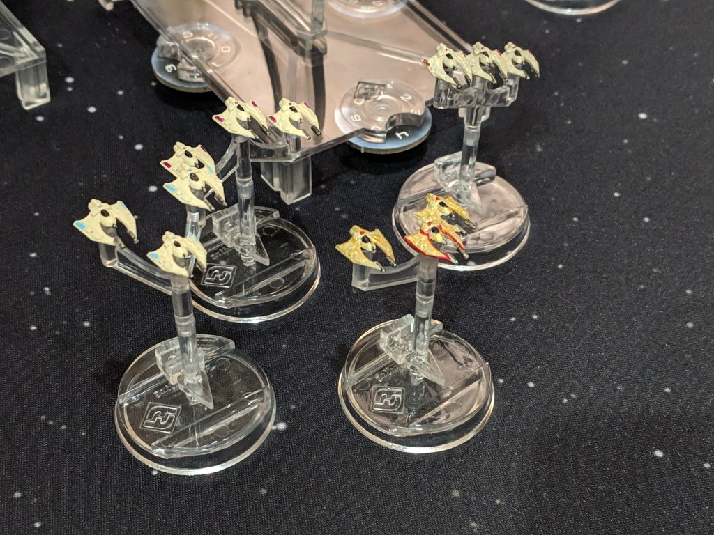 What we’ve got is essentially a bigger, slightly different Quasar. Comparing the two, for 16 points more we’ve added a shield point and swapped two blue die for reds in the front – now the mothership can get a helpful shot off, too. It’s a little less maneuverable at Speed 1, but does have the extra Contain token. In place of one hull point we’ve increased Squadron to 4 and brought Engineering to 3 (to compensate for less armor). Finally its gained a Fleet Command, which is a natural slot for All Fighters, Follow Me!.