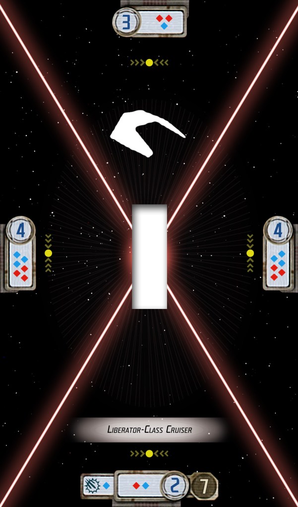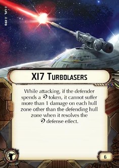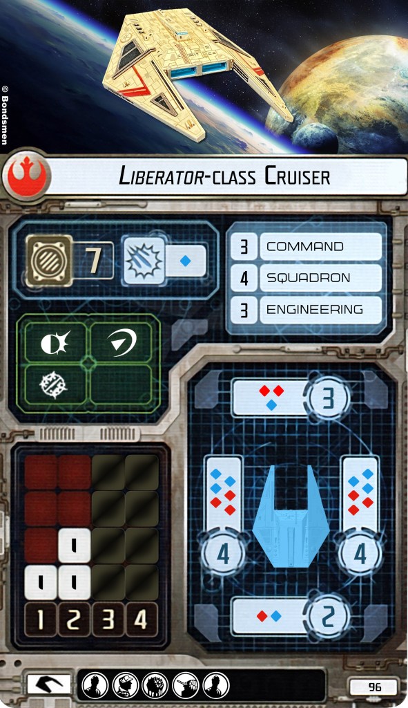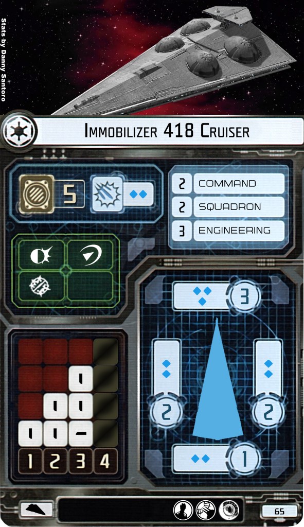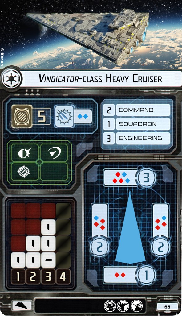 The concept behind this ship is a clear “shoot first, ask questions later” policy. With three red dice and blue dice on its three attack arcs and both a Turbolaser and Ion Cannon slot, you could outfit it for sniping (like a CR90 on steroids):
